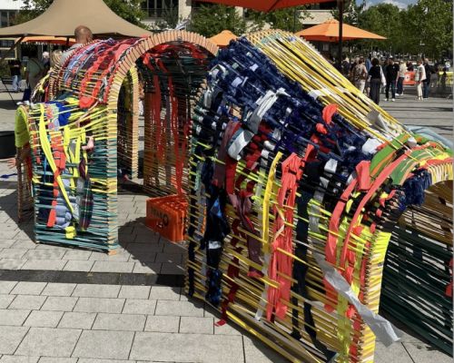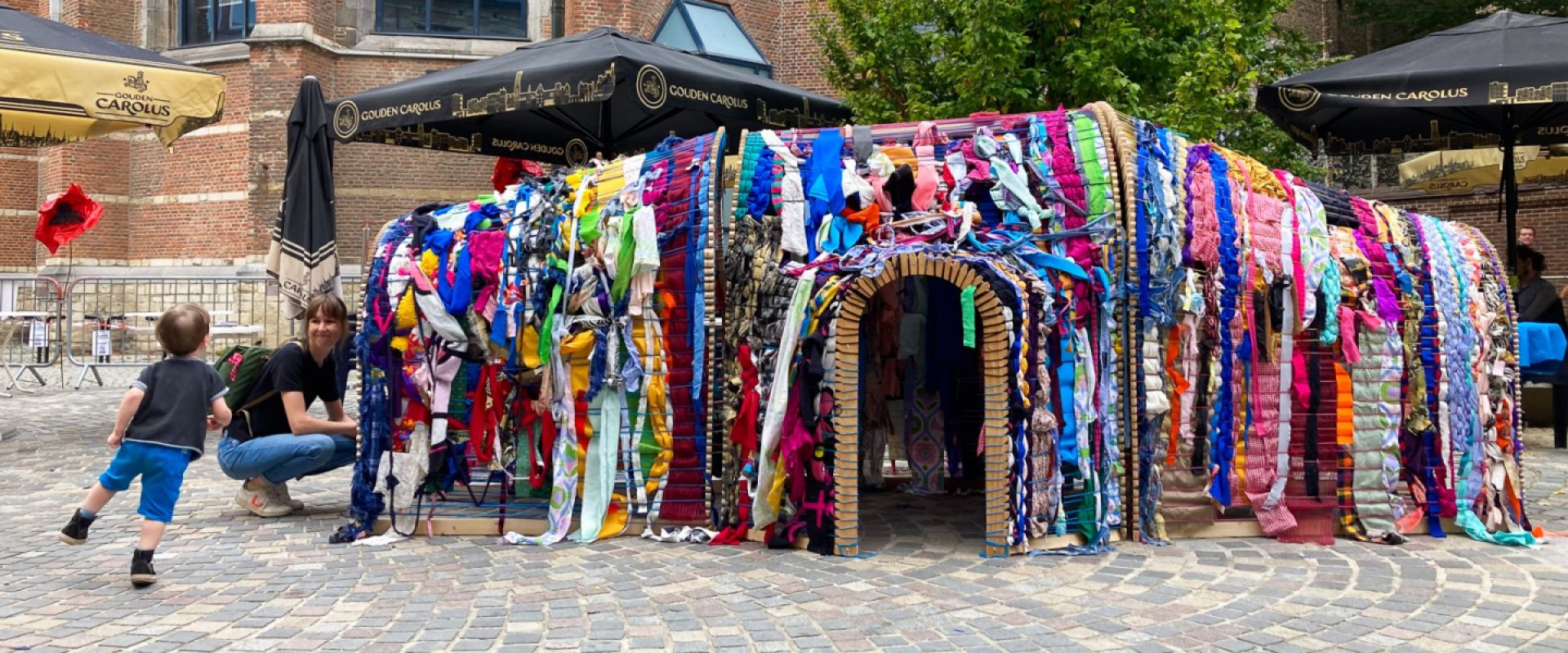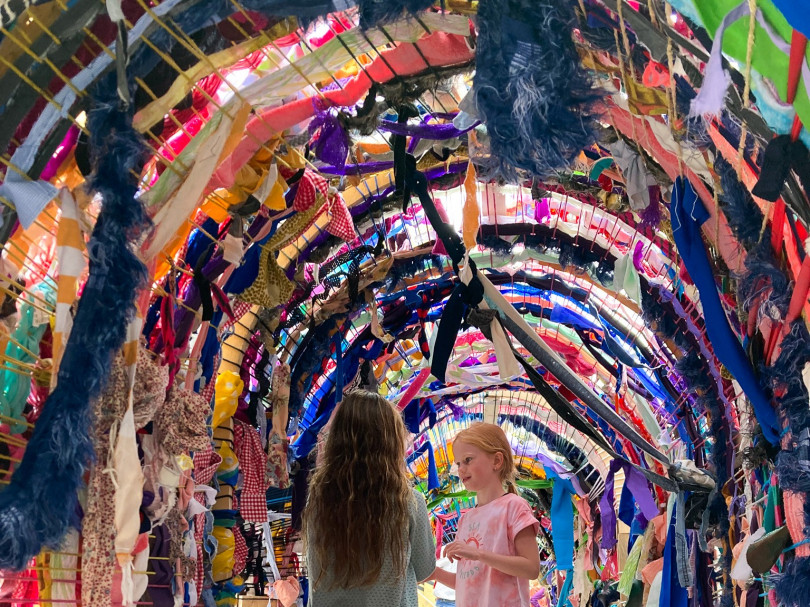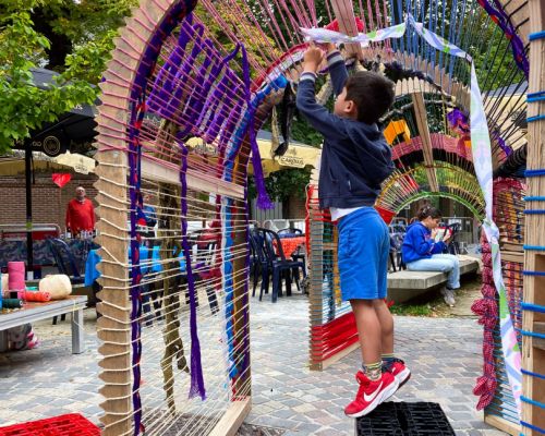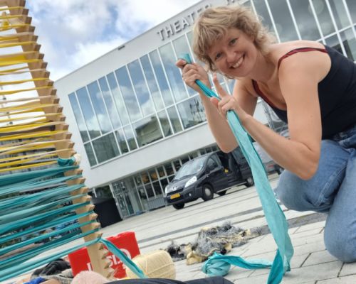 ‘Heimweefsel’ is een kleurrijke ontmoetingsplek: je kunt er tussendoor lopen, je verstoppen, praten, bouwen en natuurlijk … weven!