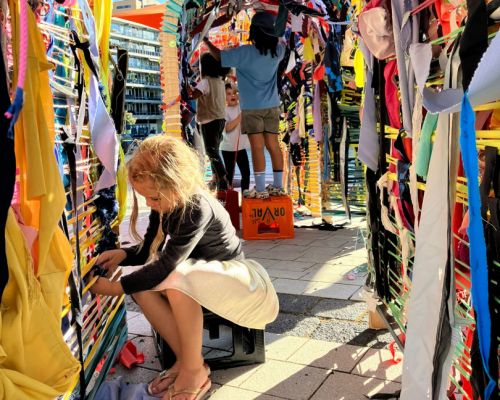 Het idee komt van beeldend kunstenaars Lotte Boonstra en Sven Roofthooft, die in hun werk de massa’s die we zelf creëren onder de loep nemen. ‘Heimweefsel’ prikkelt om na te denken over de berg textiel die we consumeren, maar nodigt vooral uit om samen iets nieuws te maken – een plek waar je je thuis kunt voelen.